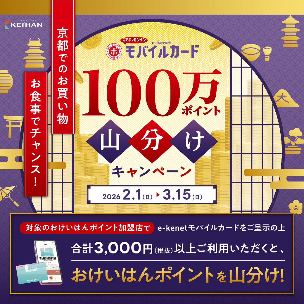 期間中、対象のおけいはんポイント加盟店でe-kenetモバイルカードをご呈示の上、合計3,000円(税抜)以上ご利用していただいた方を対象に、100万ポイントを山分け!